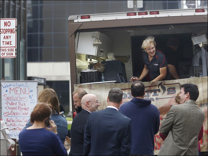 "Lisa Deeter, co-owner of Deet’s BBQ, center, takes orders from hungry customers in the company’s food truck in downtown Toledo."