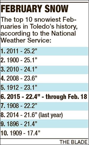 Currently, this month is the sixth snowiest February for Toledo, since record-keeping began. Toledo Express Airport is the official recording spot.