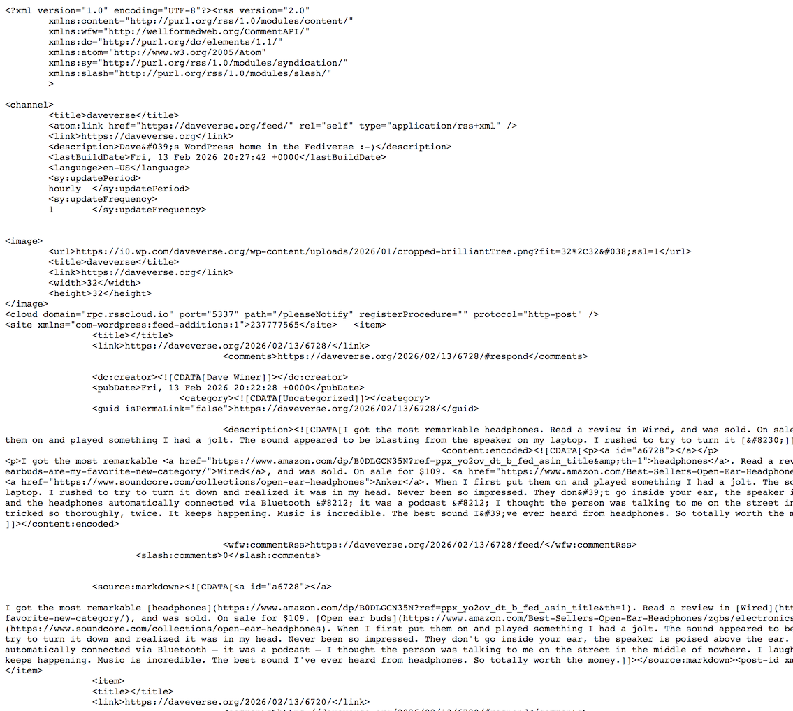 Automattic shipped a WordPress plugin that adds a source:markdown element to a WordPress feed. This is very cool. We've added this to the feed for daveverse site.